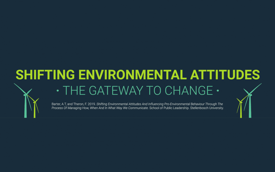 *Barter, A.T, and Theron, F. 2019. Shifting Environmental Attitudes And Influencing Pro-Environmental Behaviour Through The Process Of Managing How, When And In What Way We Communicate. School of Public Leadership. Stellenbosch University.